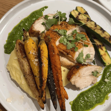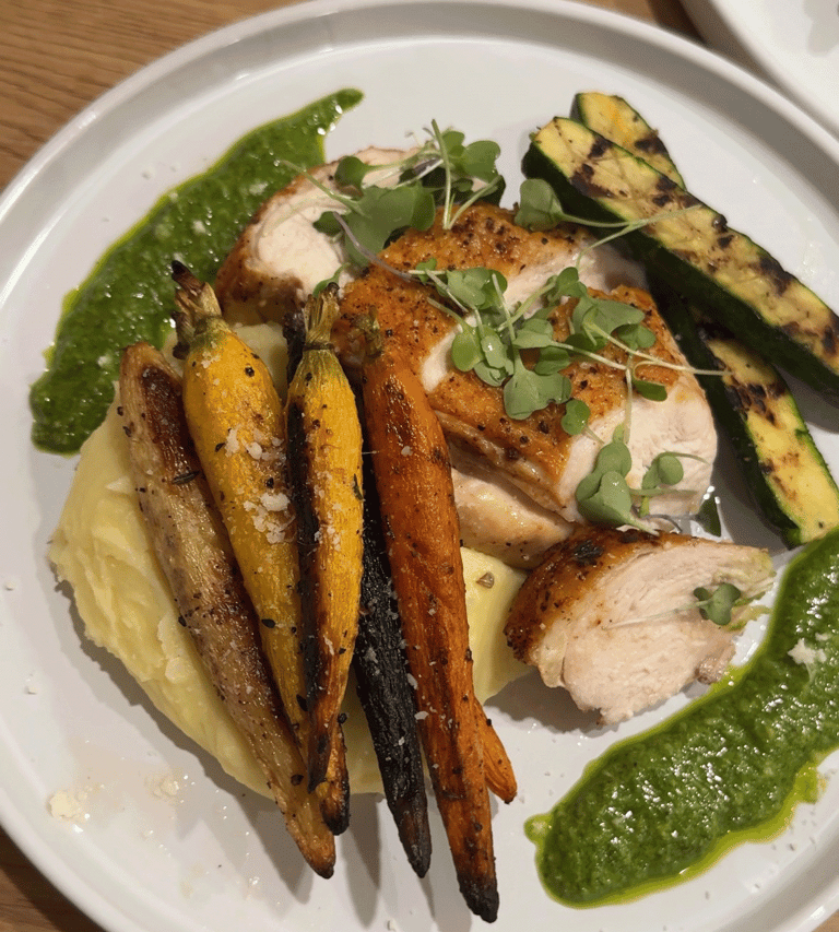 Crispy Skin Chicken with Creamy Mashed Potatoes & Roasted Seasonal Veg